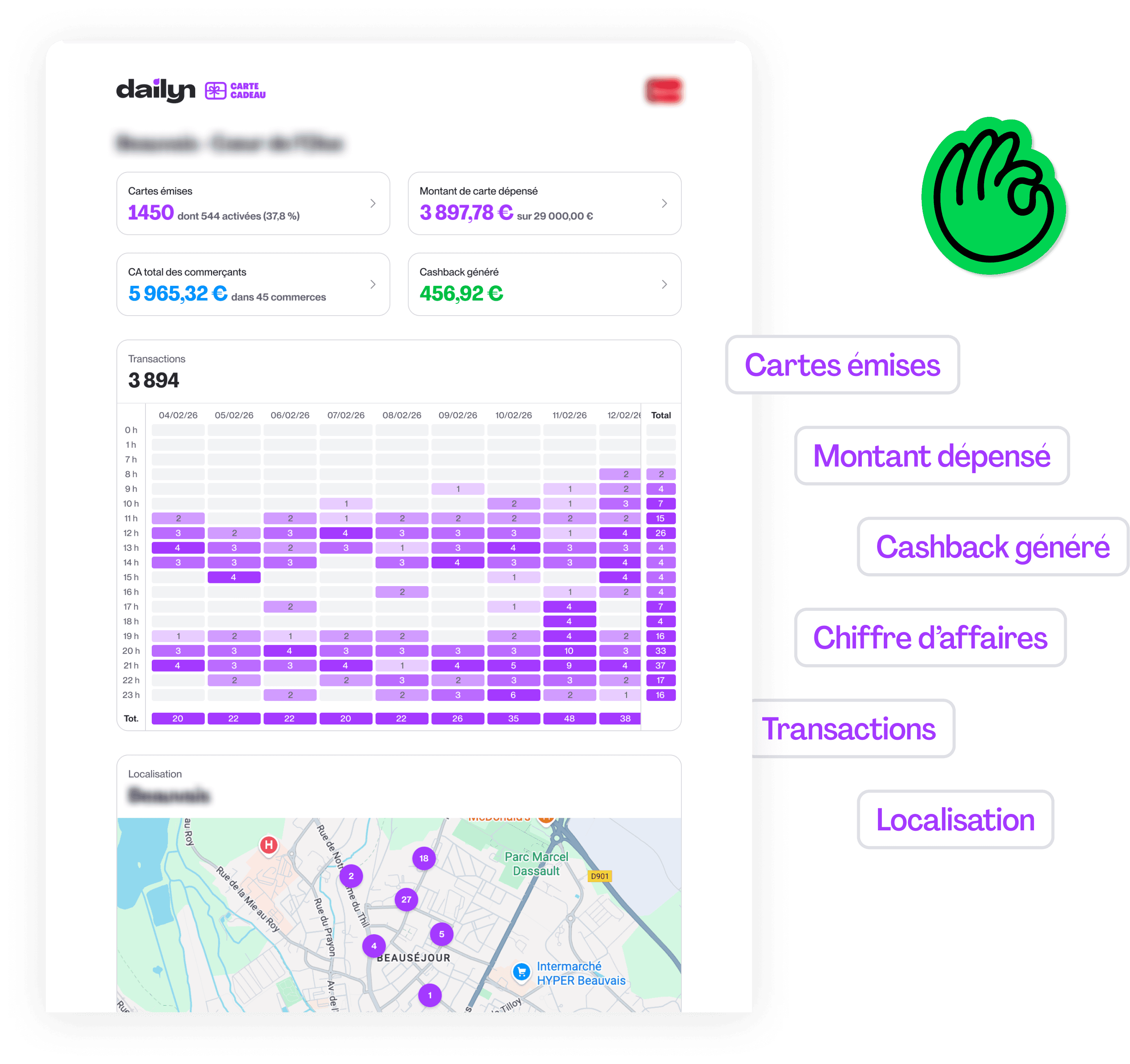 Suivez en instantané la consommation des cartes cadeaux distribuées, l'impact chez les commerçants de proximité, et le cashback récupéré par les porteurs de carte !